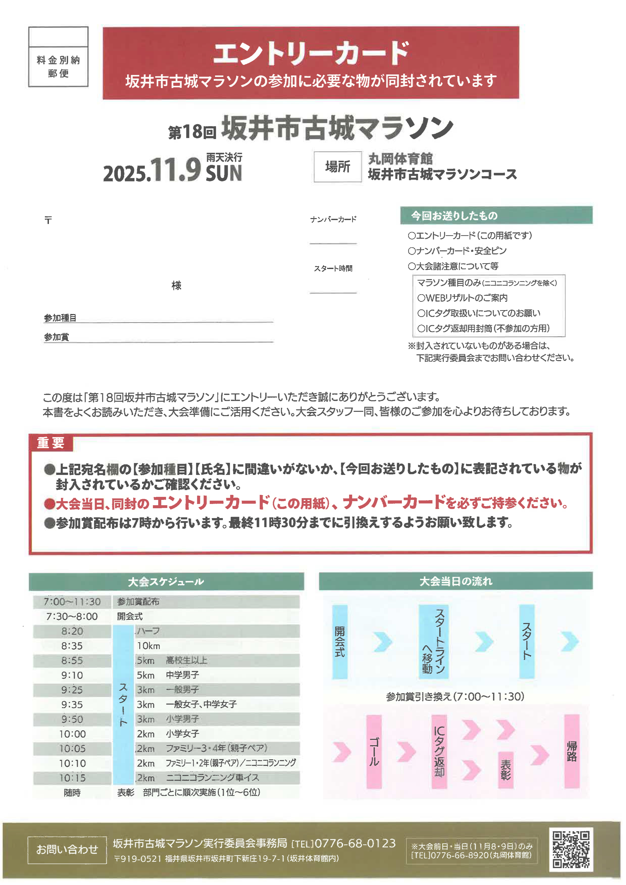 古城マラソン参加者の皆様へ以下の配布物を郵送しました。 ご参加には必ずエントリーカードとナンバーカードが必要です。 ナンバーカードを忘れた場合はご参加できません。 以下の配布物が無い場合は、実行委員会までご連絡ください。 坂井市古城マラソン実行委員会事務局 7日金曜日17時まで【電話】0776-68-0123 8日土曜日8:30から大会当日まで 【電話】0776-66-8920 大会翌日10日月曜日以降【電話】0776-68-0123 |