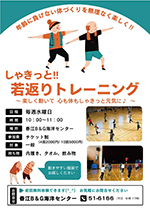 | 年齢に負けないからだづくりを無理なく楽しく!! 週に1度の定期的な運動で心も身体も若々しさを保ちましょう♪ エアロビクスで身体を動かし、後半はストレッチを行います。 お申込み/お問合せ 春江B&G海洋センター ☎51-6166 |